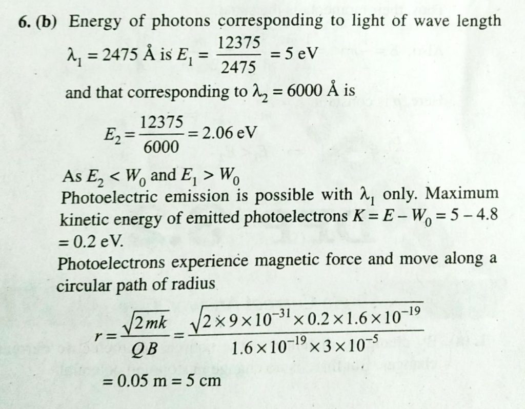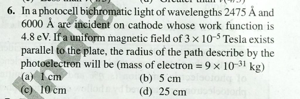 In a photocell bichromatic light of wavelength `2475 Å` and `6000 Å` are incident on cathode whose work function is `4.8 eV`. If a uniform magnetic field of `3 xx 10^(-5) Tesla` exists parallel to the plate , the radius of the path describe by the photo electron will be (mass of electron ` = 9 x 10^(-31) kg`)