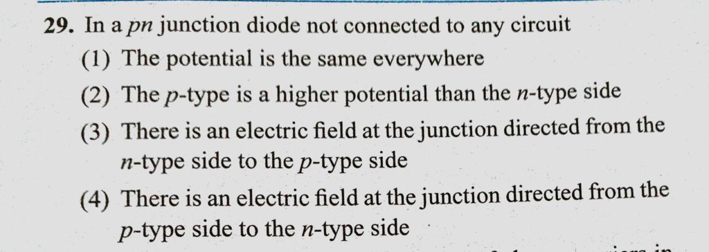 In a pn junction diode not connected to any circuit (1) The potential is the same everywhere (2) The p-type is a higher potential than the n-type side (3) There is an electric field at the junction directed from the n-type side to the p-type side. then the correct connections will be Two pn junctions can be connected in series by three different methods as shown in the figure. If the potential difference in the junctions is the same October 21, 2020 Category: Uncategorised (JEE Advanced Physics by BM Sharma + GMP Solutions) , Facebook Messenger WhatsApp Share this:TwitterFacebook Related