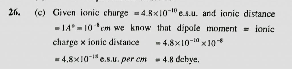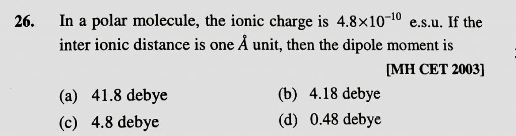 In a polar molecule, the ionic charge is 4.8 x 10^-10 e.s.u. If the inter ionic distance is one A unit , then the dipole moment is In a polar molecule the ionic charge is 4.8 x 10^-10 e.s.u. If the inter ionic distance is one A unit then the dipole moment is December 2, 2020 Category: Uncategorised (JEE Advanced Physics by BM Sharma + GMP Solutions) , Facebook Messenger WhatsApp Share this:TwitterFacebook Related