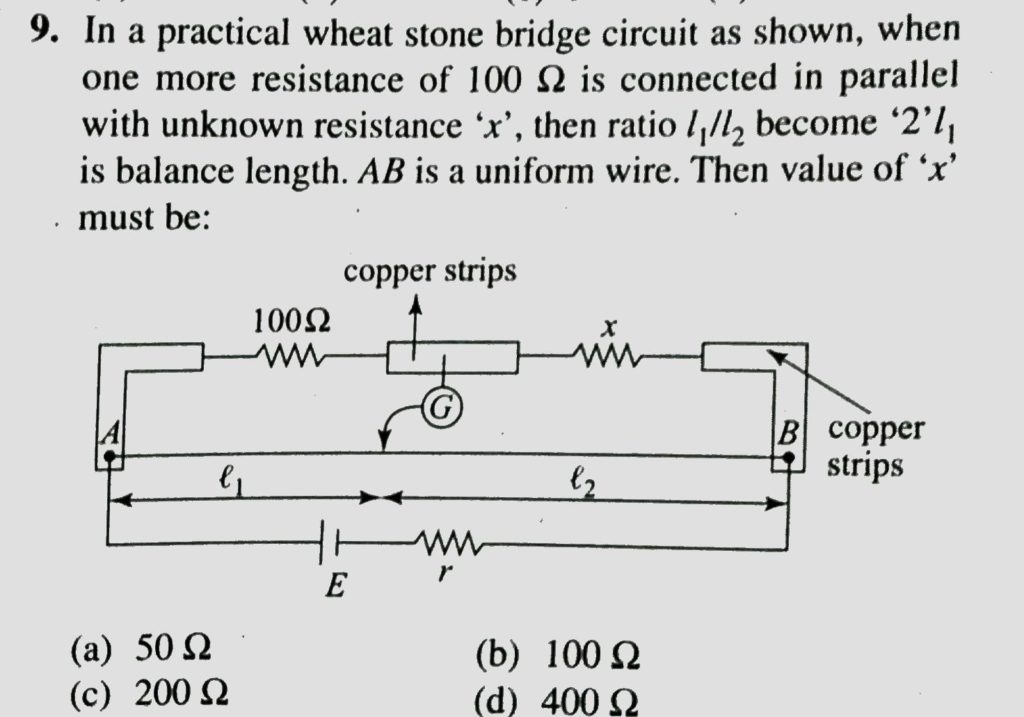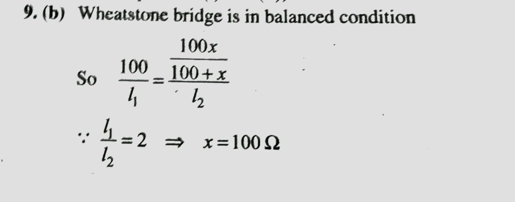 In a practical wheat stone bridge circuit as shown, when one more resistance of 100Ω is connected in parallel with unknown resistance ‘x’, then ratio l1/l2 become ‘2’l1 is balance length , AB is a uniform wire. Then value of ‘x’ must be : AB is a uniform wire. Then value of 'x' must be : In a practical wheat stone bridge circuit as shown then ratio l1/l2 become '2'l1 is balance length when one more resistance of 100Ω is connected in parallel with unknown resistance 'x' September 20, 2020 Category: Uncategorised (JEE Advanced Physics by BM Sharma + GMP Solutions) , Facebook Messenger WhatsApp Share this:TwitterFacebook Related