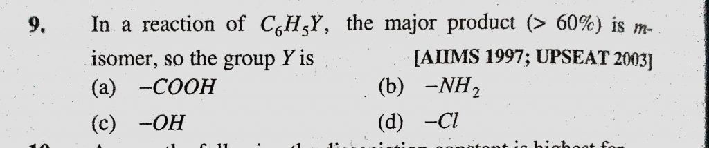 In a reaction of C6H5Y, the major product (>60%) is m-isomer, so the group Y is (a) -COOH (b) -NH2 (c) -OH (d) -Cl In a reaction of C6H5Y so the group Y is (a) -COOH (b) -NH2 (c) -OH (d) -Cl the major product (>60%) is m-isomer December 11, 2020 Category: Uncategorised (JEE Advanced Physics by BM Sharma + GMP Solutions) , Facebook Messenger WhatsApp Share this:TwitterFacebook Related