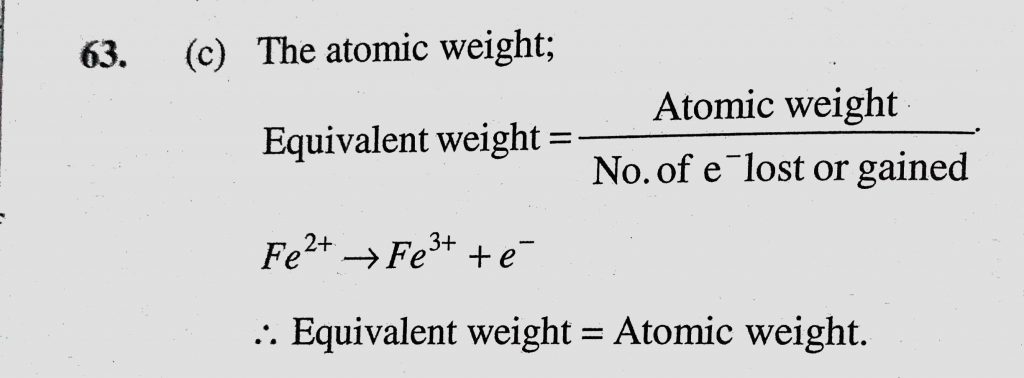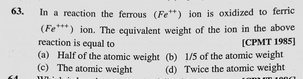 In a reaction the ferrous (Fe++) ion is oxidized to ferric (Fe+++) ion. The equivalent weight of the ion in the above reaction is equal to (a) Half of the atomic weight In a reaction the ferrous (Fe++) ion is oxidized to ferric (Fe+++) ion. The equivalent weight of the ion in the above reaction is equal to (a) Half of the atomic weight November 29, 2020 Category: Uncategorised (JEE Advanced Physics by BM Sharma + GMP Solutions) , Facebook Messenger WhatsApp Share this:TwitterFacebook Related