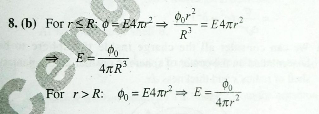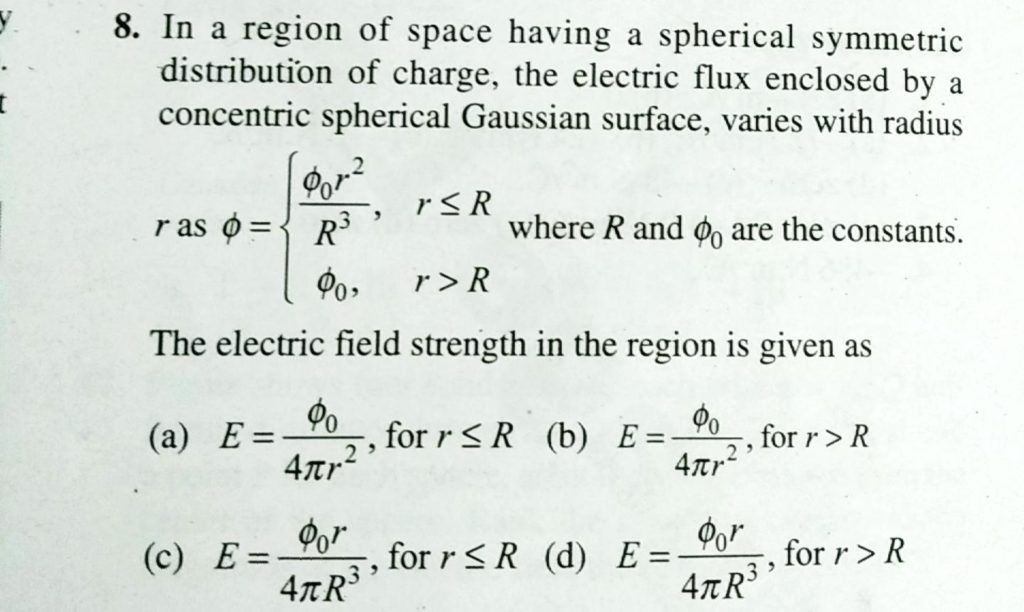 In a region of space having a spherical symmetric distribution of charge , the electric flux enclosed by a concentric spherical Gaussion surface, varies with radius r as ϕ={ϕ 0r^2/R^3, r≤R ϕ0 , <R where R and ϕ0 are the constants. <R where R and ϕ0 are the constants. In a region of space having a spherical symmetric distribution of charge r≤R ϕ0 the electric flux enclosed by a concentric spherical Gaussion surface varies with radius r as ϕ={ϕ 0r^2/R^3 September 17, 2020 Category: Uncategorised (JEE Advanced Physics by BM Sharma + GMP Solutions) , Facebook Messenger WhatsApp Share this:TwitterFacebook Related