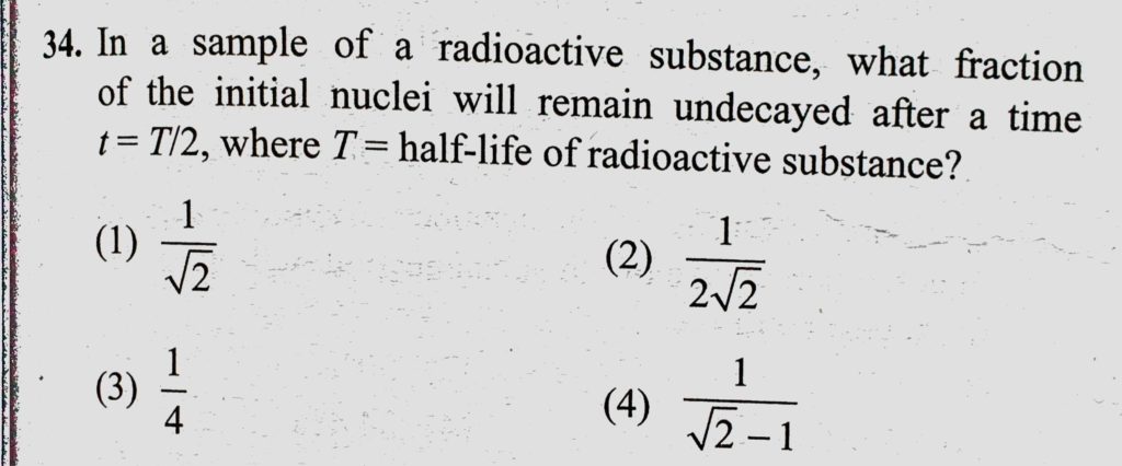 In a sample of a radioactive substance, what fraction of the initial nuclei will remain undecayed after a time t = T/2, where T = half-life of radioactive substance ? In a sample of a radioactive substance what fraction of the initial nuclei will remain undecayed after a time t = T/2 where T = half-life of radioactive substance ? October 17, 2020 Category: Uncategorised (JEE Advanced Physics by BM Sharma + GMP Solutions) , Facebook Messenger WhatsApp Share this:TwitterFacebook Related
