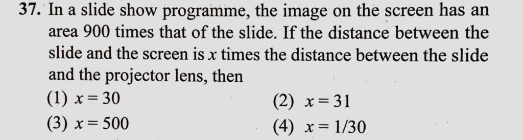 In a slide show programme, the image on the screen has an area 900 times that of the slide. If the distance between the slide and the screen is x times the distance between the slide and the projector In a slide show programme the image on the screen has an area 900 times that of the slide. If the distance between the slide and the screen is x times the distance between the slide and the projector October 8, 2020 Category: Uncategorised (JEE Advanced Physics by BM Sharma + GMP Solutions) , Facebook Messenger WhatsApp Share this:TwitterFacebook Related