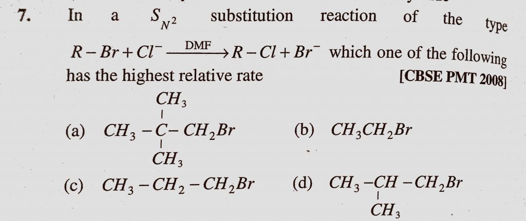 In a SN^2 substitution reaction of the type R – Br + Cl- to R – Cl + Br- which one of the following has the highest relative rate In a SN^2 substitution reaction of the type R - Br + Cl- to R - Cl + Br- which one of the following has the highest relative rate December 9, 2020 Category: Uncategorised (JEE Advanced Physics by BM Sharma + GMP Solutions) , Facebook Messenger WhatsApp Share this:TwitterFacebook Related