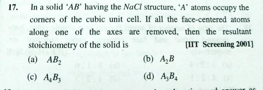 In a solid ‘AB’ having the NaCl structure , ‘A’ atoms occupy the corners of the cubic unit cell . If all the face – centred atoms along one of the axes are removed , then the resultant stoichiometry of the solid is 'A' atoms occupy the corners of the cubic unit cell . If all the face - centred atoms along one of the axes are removed In a solid AB having the NaCl structure then the resultant stoichiometry of the solid is February 9, 2021 Category: Uncategorised (JEE Advanced Physics by BM Sharma + GMP Solutions) , Facebook Messenger WhatsApp Share this:TwitterFacebook Related
