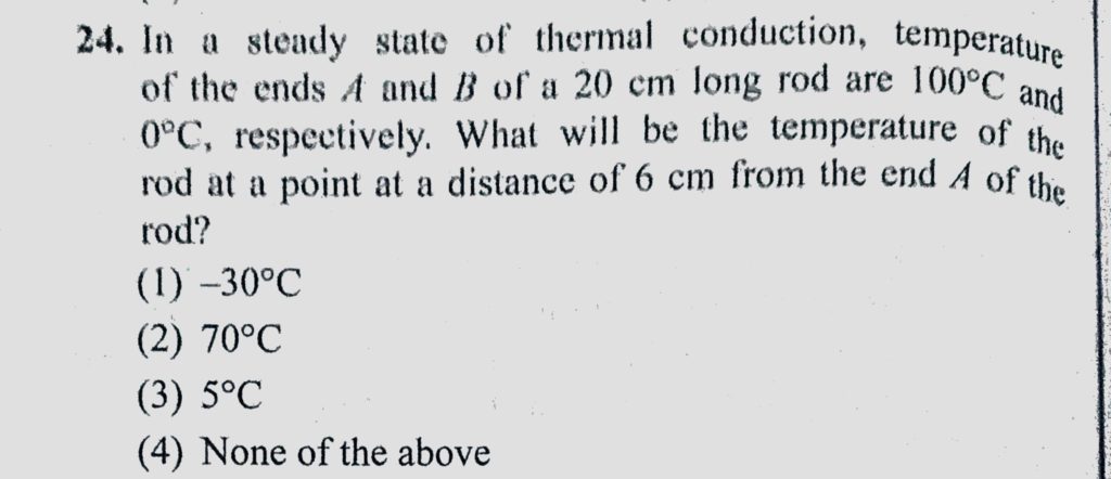 In a steady state of thermal conduction, temperature of the ends A and B of a 20 cm long rod are 100 c and 0 C, respectively. What will be the temperature of the rod at a point In a steady state of thermal conduction respectively. What will be the temperature of the rod at a point temperature of the ends A and B of a 20 cm long rod are 100 c and 0 C October 25, 2020 Category: Uncategorised (JEE Advanced Physics by BM Sharma + GMP Solutions) , Facebook Messenger WhatsApp Share this:TwitterFacebook Related