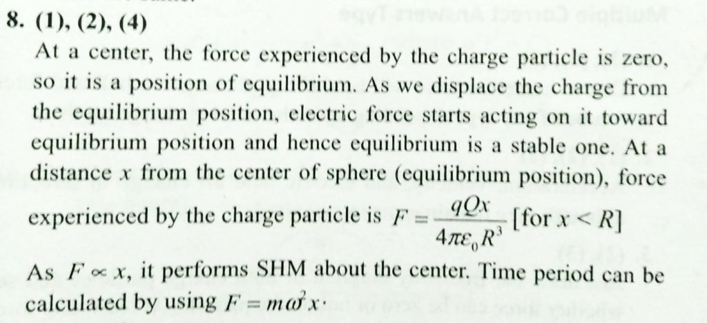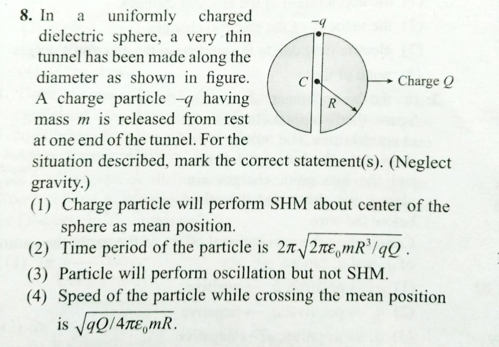 In a uniformly charged dielectric sphere, a very thin tunnel has been made along the diameter as shown in figure. A charge partivel −q having mass m is released from rest at one end of the tunnel. For the situation described, mark the correct statement(s), (neglect gravity).