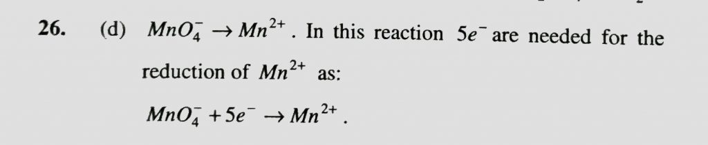 In acid solution , the reaction MnO4^- gives Mn^2+ involves (a) Oxidation by 3 electrons (b) reduction by 3 electrons (c) oxidation by 5 electrons (d) reduction by 5 electrons In acid solution the reaction MnO4^- gives Mn^2+ involves (a) Oxidation by 3 electrons (b) reduction by 3 electrons (c) oxidation by 5 electrons (d) reduction by 5 electrons November 23, 2020 Category: Uncategorised (JEE Advanced Physics by BM Sharma + GMP Solutions) , Facebook Messenger WhatsApp Share this:TwitterFacebook Related