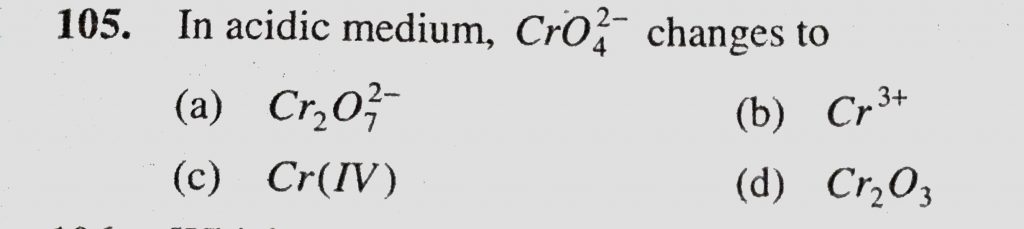 In acidic medium, CrO4 2- changes to (a) Cr2O7 2- (b) Cr 3+ (c) Cr (IV) (d) Cr2O3 CrO4 2- changes to (a) Cr2O7 2- (b) Cr 3+ (c) Cr (IV) (d) Cr2O3 In acidic medium December 1, 2020 Category: Uncategorised (JEE Advanced Physics by BM Sharma + GMP Solutions) , Facebook Messenger WhatsApp Share this:TwitterFacebook Related