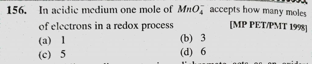 In acidic medium one mole of MnO4- accepts how many moles of electrons in a redox process (a) 1 (b) 3 (c) 5 (d) 6 In acidic medium one mole of MnO4- accepts how many moles of electrons in a redox process (a) 1 (b) 3 (c) 5 (d) 6 December 1, 2020 Category: Uncategorised (JEE Advanced Physics by BM Sharma + GMP Solutions) , Facebook Messenger WhatsApp Share this:TwitterFacebook Related