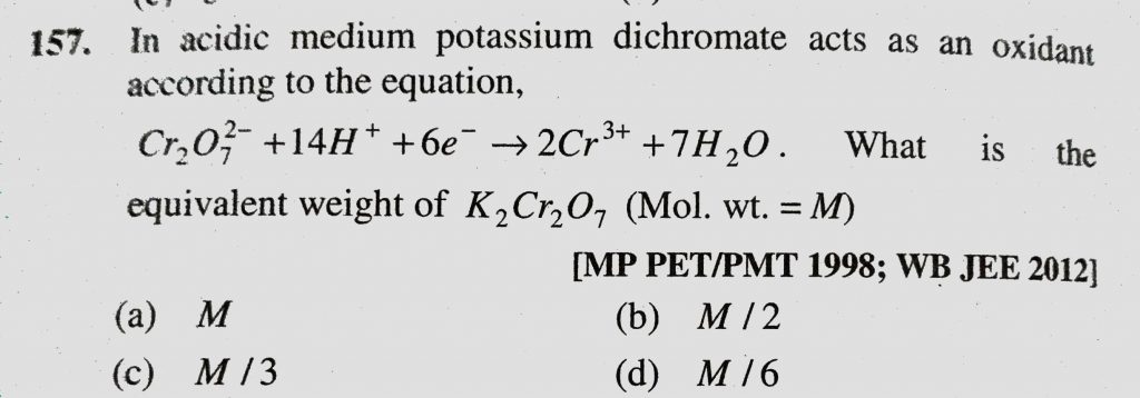 In acidic medium potassium dichromate acts as on oxidant according to the equation, Cr2O+14H++6e−→2Cr3++7H2O. What is the equivalent weight of K2Cr2O7? (mol. Wt.=M) Cr2O+14H++6e−→2Cr3++7H2O. What is the equivalent weight of K2Cr2O7? (mol. Wt.=M) In acidic medium potassium dichromate acts as on oxidant according to the equation December 1, 2020 Category: Uncategorised (JEE Advanced Physics by BM Sharma + GMP Solutions) , Facebook Messenger WhatsApp Share this:TwitterFacebook Related