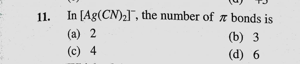 In (Ag(CN)2)- the number of pie bonds is (a) 2 (b) 3 (c) 4 (d)6 In (Ag(CN)2)- the number of pie bonds is (a) 2 (b) 3 (c) 4 (d)6 December 3, 2020 Category: Uncategorised (JEE Advanced Physics by BM Sharma + GMP Solutions) , Facebook Messenger WhatsApp Share this:TwitterFacebook Related