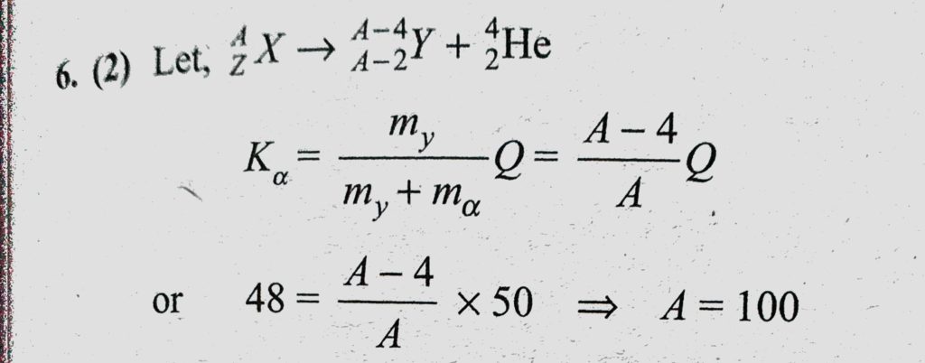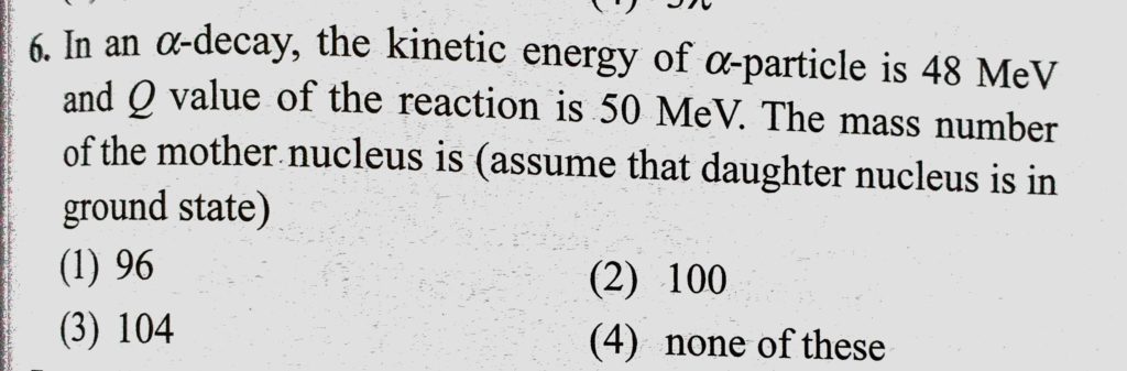 In an alpha decay, the kinetic energy of alpha particle is 48 MeV and Q value of the reaction is 50 MeV. The mass number of the mother nucleus is (assume that daughter nucleus is in ground state) In an alpha decay the kinetic energy of alpha particle is 48 MeV and Q value of the reaction is 50 MeV. The mass number of the mother nucleus is (assume that daughter nucleus is in ground state) October 17, 2020 Category: Uncategorised (JEE Advanced Physics by BM Sharma + GMP Solutions) , Facebook Messenger WhatsApp Share this:TwitterFacebook Related