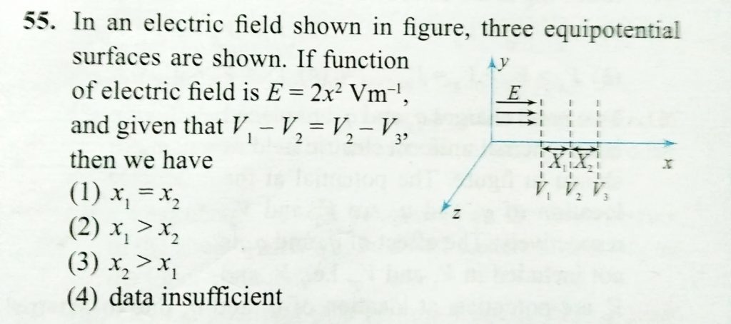 In an electric field shown in figure, three equipotential surfaces are shown . If function of electric field is E = 2x^2 V/m, and given that V1 – V2 = V2 – V3, then we have and given that V1 - V2 = V2 - V3 In an electric field shown in figure then we have three equipotential surfaces are shown . If function of electric field is E = 2x^2 V/m November 6, 2020 Category: Uncategorised (JEE Advanced Physics by BM Sharma + GMP Solutions) , Facebook Messenger WhatsApp Share this:TwitterFacebook Related