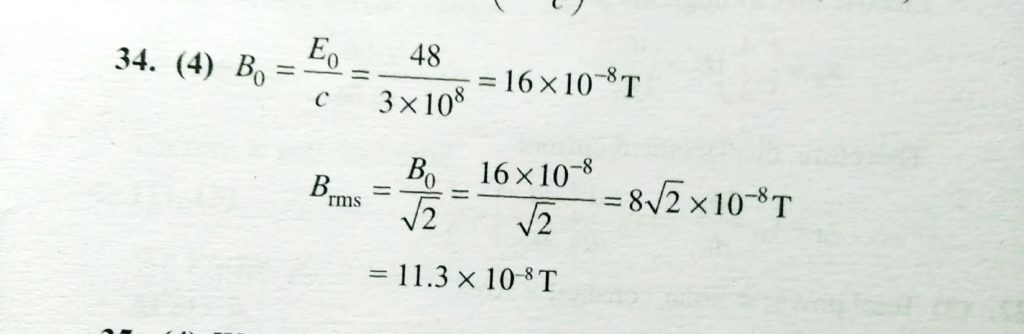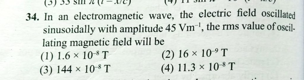 In an electromagnetis wave , teh electric field oscillated sinusoidally with amplitude 45 V/m, the rms value of oscillating magnetic filed will be In an electromagnetis wave teh electric field oscillated sinusoidally with amplitude 45 V/m the rms value of oscillating magnetic filed will be October 29, 2020 Category: Uncategorised (JEE Advanced Physics by BM Sharma + GMP Solutions) , Facebook Messenger WhatsApp Share this:TwitterFacebook Related