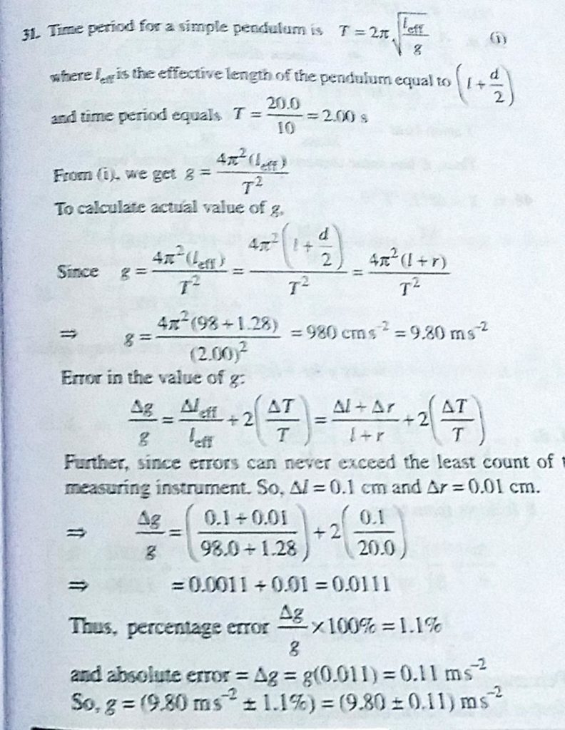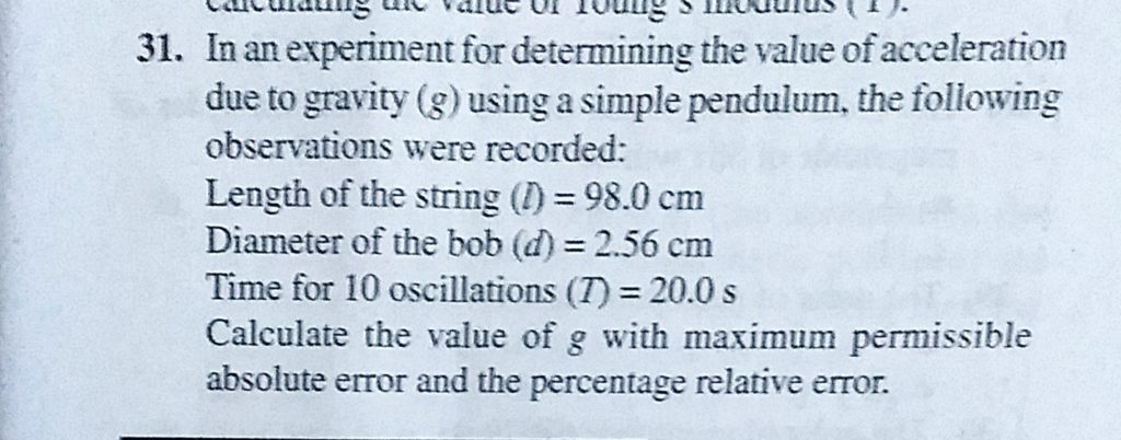 In an experiment for detemining the value of acceleration due to gravity (g) using a simple pendulum, the following observations were recorded: Length of the string(l) = 98.0 cm In an experiment for detemining the value of acceleration due to gravity (g) using a simple pendulum the following observations were recorded: Length of the string(l) = 98.0 cm September 14, 2020 Category: Uncategorised (JEE Advanced Physics by BM Sharma + GMP Solutions) , Facebook Messenger WhatsApp Share this:TwitterFacebook Related