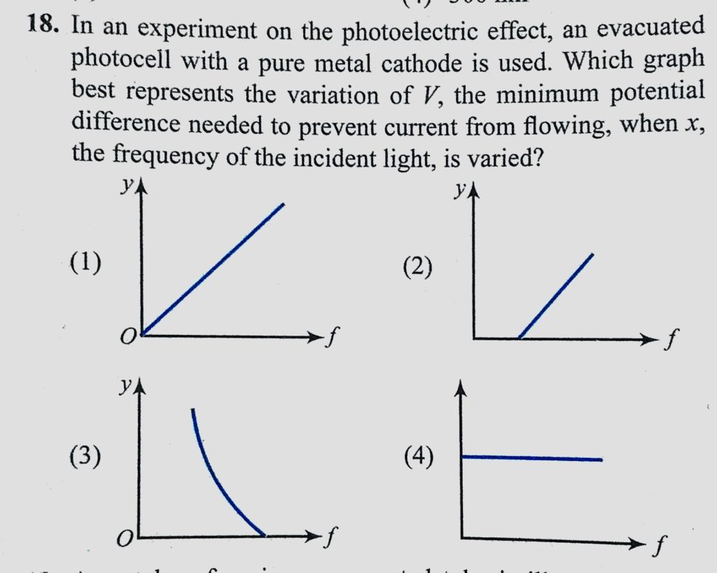 In an experiment on the photoelectric effect, an evacuated photocell with a pure metal cathode is used. Which graph best represents the variation of V, the minimum potential difference an evacuated photocell with a pure metal cathode is used. Which graph best represents the variation of V In an experiment on the photoelectric effect the minimum potential difference October 12, 2020 Category: Uncategorised (JEE Advanced Physics by BM Sharma + GMP Solutions) , Facebook Messenger WhatsApp Share this:TwitterFacebook Related