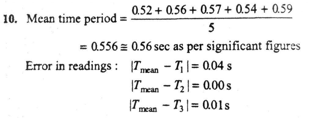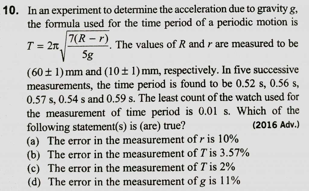 In an experiment to determine the acceleration due to gravity g, the formula used for the time period of a periodic motion is T=2π(7R−r5g−−−−−−−−√. The values of Randr are measured to be (60±1)mmand(10±1)mm, repectively. In five successive measurment, the time period is found to be 0.52s,0.56s,0.57s,0.54sand0.59s. the least count of the watch used for the measurement of time period is 0.01s. Which of the following statement (s) is (are) true?