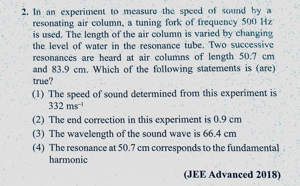 In an experiment to measure the speed of sound by a resonating air column, a tuning fork of frequency 500 Hz is used. The length of the air column is varied by changing the level a tuning fork of frequency 500 Hz is used. The length of the air column is varied by changing the level In an experiment to measure the speed of sound by a resonating air column November 7, 2020 Category: Uncategorised (JEE Advanced Physics by BM Sharma + GMP Solutions) , Facebook Messenger WhatsApp Share this:TwitterFacebook Related