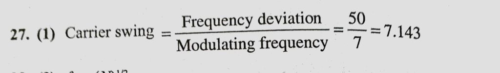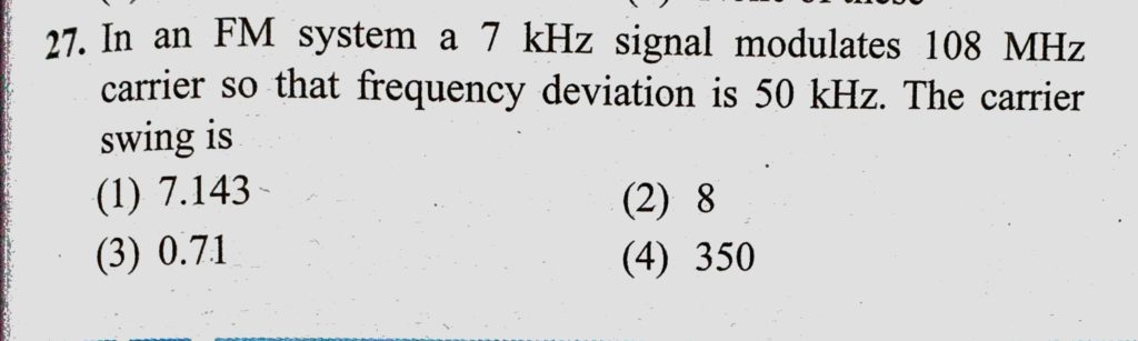 In an FM system a 7 kHz signal modulates 108 MHz carrier so that frequency deviation is 50 KHz. The carrier swing is In an FM system a 7 kHz signal modulates 108 MHz carrier so that frequency deviation is 50 KHz. The carrier swing is October 23, 2020 Category: Uncategorised (JEE Advanced Physics by BM Sharma + GMP Solutions) , Facebook Messenger WhatsApp Share this:TwitterFacebook Related