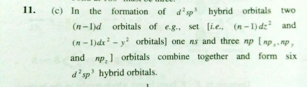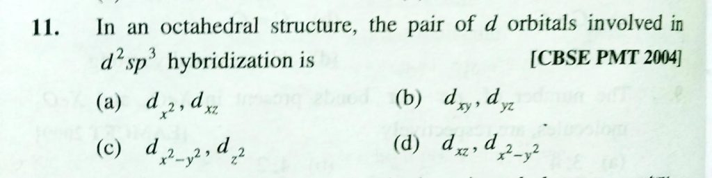 In an octahedral structure , the pair of d orbitals involved in d^2sp^3 hybridization is In an octahedral structure the pair of d orbitals involved in d^2sp^3 hybridization is December 2, 2020 Category: Uncategorised (JEE Advanced Physics by BM Sharma + GMP Solutions) , Facebook Messenger WhatsApp Share this:TwitterFacebook Related