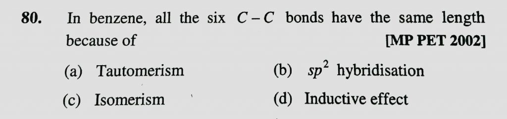 In benzene , all the six C – C bonds have the same length because of (a) Tautomerism (b) sp^2 hybridisation (c) Isomerism (d) Inductive effect all the six C - C bonds have the same length because of (a) Tautomerism (b) sp^2 hybridisation (c) Isomerism (d) Inductive effect In benzene December 6, 2020 Category: Uncategorised (JEE Advanced Physics by BM Sharma + GMP Solutions) , Facebook Messenger WhatsApp Share this:TwitterFacebook Related