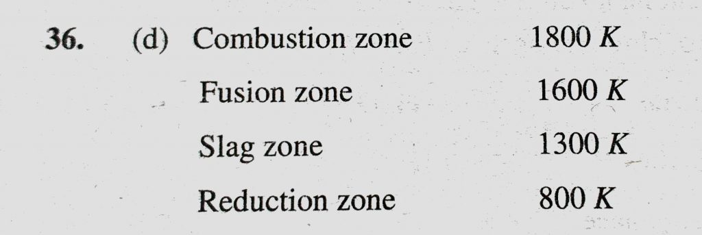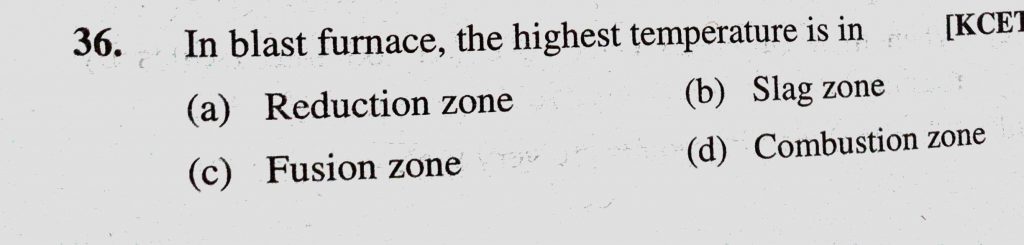 In blast furnace, the highest temperature is in (a) Reduction zone (b) Slag zone (c) Fusion Zone (d) Combustion zone In blast furnace the highest temperature is in (a) Reduction zone (b) Slag zone (c) Fusion Zone (d) Combustion zone November 12, 2020 Category: Uncategorised (JEE Advanced Physics by BM Sharma + GMP Solutions) , Facebook Messenger WhatsApp Share this:TwitterFacebook Related