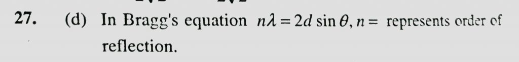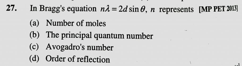 In Bragg’s equation nlamda = 2d sin theta , n represents (a) number of moles (b) principal quantum number (c) Avogardo’s number (d) Order of reflection In Bragg's equation nlamda = 2d sin theta n represents (a) number of moles (b) principal quantum number (c) Avogardo's number (d) Order of reflection February 9, 2021 Category: Uncategorised (JEE Advanced Physics by BM Sharma + GMP Solutions) , Facebook Messenger WhatsApp Share this:TwitterFacebook Related