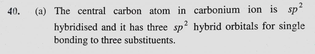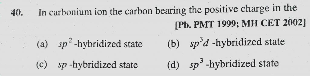 In carbonium ion the carbon bearing the positive charge in the (a) sp2 hybridized state (b) sp3d hybridized state In carbonium ion the carbon bearing the positive charge in the (a) sp2 hybridized state (b) sp3d hybridized state December 9, 2020 Category: Uncategorised (JEE Advanced Physics by BM Sharma + GMP Solutions) , Facebook Messenger WhatsApp Share this:TwitterFacebook Related