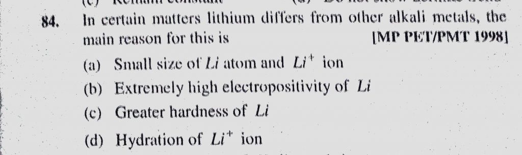 In certain matters lithium differs from other alkali metals, the main reason for this is (a) Small size of Li atom and Li+ ion In certain matters lithium differs from other alkali metals the main reason for this is (a) Small size of Li atom and Li+ ion November 15, 2020 Category: Uncategorised (JEE Advanced Physics by BM Sharma + GMP Solutions) , Facebook Messenger WhatsApp Share this:TwitterFacebook Related