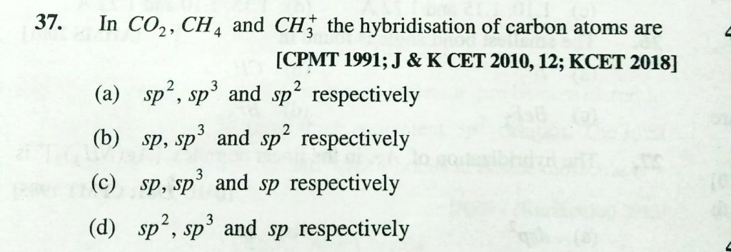 In CO2 , CH4 and CH3^+ the hybridisation of carbon atoms are (a) sp^2 , sp^3 and sp^2 respectively (b) sp , sp^3 and sp^2 respectively (c) sp , sp^3 and sp respectively (d) sp^2 , sp^3 and sp respectively CH4 and CH3^+ the hybridisation of carbon atoms are (a) sp^2 In CO2 sp^3 and sp respectively sp^3 and sp respectively (d) sp^2 sp^3 and sp^2 respectively (b) sp sp^3 and sp^2 respectively (c) sp December 6, 2020 Category: Uncategorised (JEE Advanced Physics by BM Sharma + GMP Solutions) , Facebook Messenger WhatsApp Share this:TwitterFacebook Related