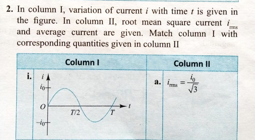 In column I , varition of current i with time t is given in the figure. In column II, root mean square current i rms and average current are given. Match column I with corresponding quantities given in column II In column I root mean square current i rms and average current are given. Match column I with corresponding quantities given in column II varition of current i with time t is given in the figure. In column II October 28, 2020 Category: Uncategorised (JEE Advanced Physics by BM Sharma + GMP Solutions) , Facebook Messenger WhatsApp Share this:TwitterFacebook Related