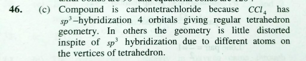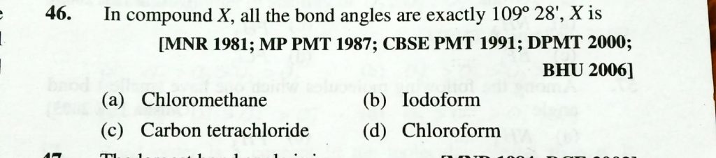 In compound X , all the bond angles are exactly 109 degree 28′ , X is (a) chloromethane (b) Idoform (c) carbon tetrachloride (d) chloroform all the bond angles are exactly 109 degree 28' In compound X X is (a) chloromethane (b) Idoform (c) carbon tetrachloride (d) chloroform December 7, 2020 Category: Uncategorised (JEE Advanced Physics by BM Sharma + GMP Solutions) , Facebook Messenger WhatsApp Share this:TwitterFacebook Related