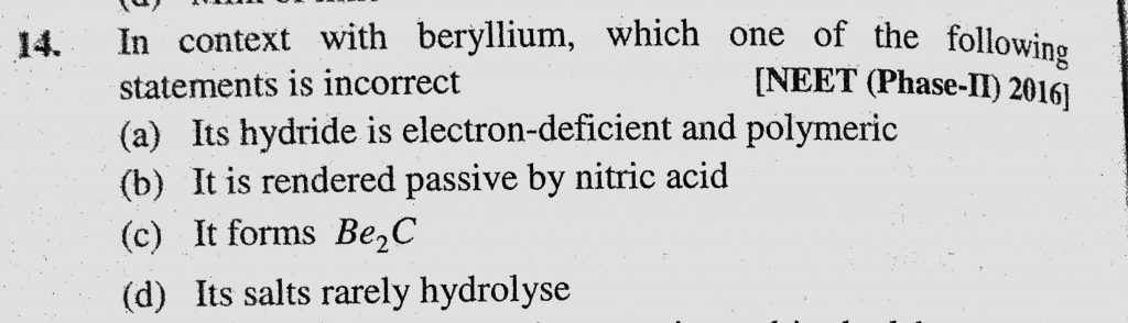 In context with beryllium, which one of the following statements is incorrect (a) Its hydride is electron-deficient and polymeric In context with beryllium which one of the following statements is incorrect (a) Its hydride is electron-deficient and polymeric November 15, 2020 Category: Uncategorised (JEE Advanced Physics by BM Sharma + GMP Solutions) , Facebook Messenger WhatsApp Share this:TwitterFacebook Related