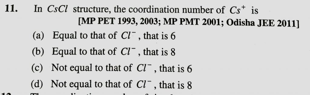 In CsCl structure , the coordination number of Cs^+ is (a) Equal to that of Cl^- , that is 6 (b) Equal to that of Cl^-, that is 8 (c) Not equal to that of Cl^- , that is 6 (c) Not equal to that of Cl^- , that is 8 In CsCL structure that is 6 (b) Equal to that of Cl^- that is 6 (c) Not equal to that of Cl^- that is 8 that is 8 (c) Not equal to that of Cl^- the coordination number of Cs^+ is (a) Equal to that of Cl^- February 9, 2021 Category: Uncategorised (JEE Advanced Physics by BM Sharma + GMP Solutions) , Facebook Messenger WhatsApp Share this:TwitterFacebook Related