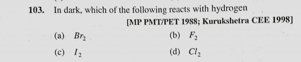 In dark, which of the following reacts with hydrogen (a) Br2 (b) F2 (c) I2 (d) Cl2 In dark which of the following reacts with hydrogen (a) Br2 (b) F2 (c) I2 (d) Cl2 November 24, 2020 Category: Uncategorised (JEE Advanced Physics by BM Sharma + GMP Solutions) , Facebook Messenger WhatsApp Share this:TwitterFacebook Related