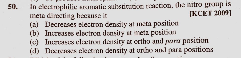 In electrophilic aromatic substitution reaction, the nitro group is meta directing because it (a) Decreases electron density at meta position (b) Increases electron density at meta position In electrophilic aromatic substitution reaction the nitro group is meta directing because it (a) Decreases electron density at meta position (b) Increases electron density at meta position December 9, 2020 Category: Uncategorised (JEE Advanced Physics by BM Sharma + GMP Solutions) , Facebook Messenger WhatsApp Share this:TwitterFacebook Related