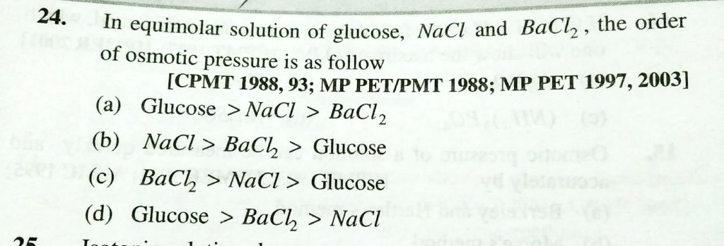 In equimolar solution of glucose , NaCL and BaCL2 , the order of osmotic pressure is as follow In equimolar solution of glucose NaCL and BaCL2 the order of osmotic pressure is as follow December 13, 2020 Category: Uncategorised (JEE Advanced Physics by BM Sharma + GMP Solutions) , Facebook Messenger WhatsApp Share this:TwitterFacebook Related