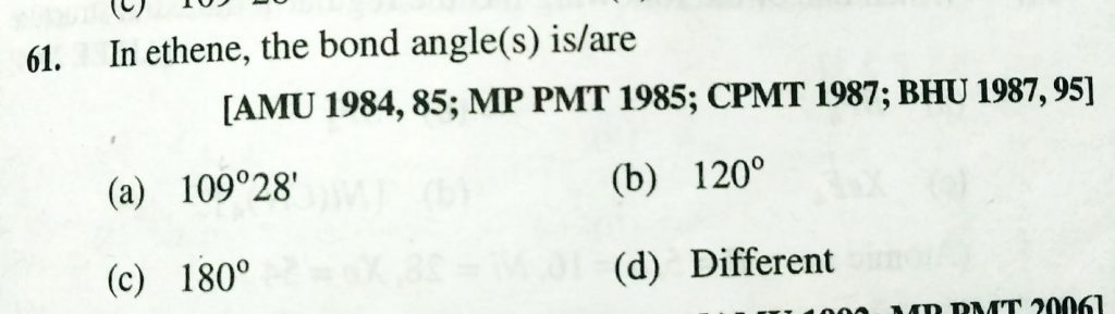 In ethene , the bond angle(s) is /are (a) 109 degrree 28′ (b) 120 degree (c) 180 degree (d) different In ethene the bond angle(s) is /are (a) 109 degrree 28' (b) 120 degree (c) 180 degree (d) different December 6, 2020 Category: Uncategorised (JEE Advanced Physics by BM Sharma + GMP Solutions) , Facebook Messenger WhatsApp Share this:TwitterFacebook Related