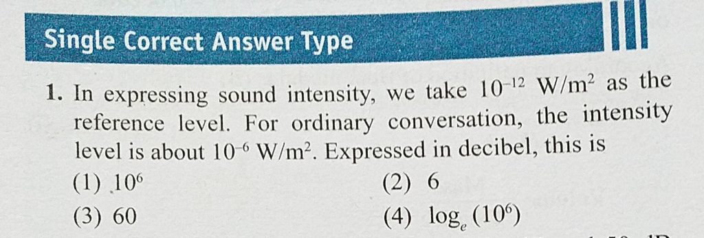 In expressing sound intensity, we take 10^-12 W/m^2 as the reference level. For ordinary conversation, the intensity level is about 10^-6 W/m^2. Expressed in decibel, this is In expressing sound intensity the intensity level is about 10^-6 W/m^2. Expressed in decibel this is we take 10^-12 W/m^2 as the reference level. For ordinary conversation November 7, 2020 Category: Uncategorised (JEE Advanced Physics by BM Sharma + GMP Solutions) , Facebook Messenger WhatsApp Share this:TwitterFacebook Related