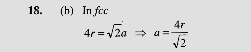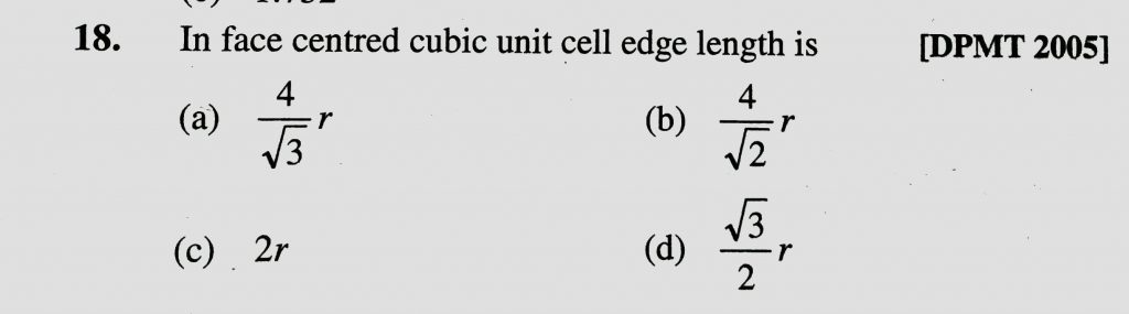 In face centred cubic unit cell edge length is (a) 4 / root 3 r (b) 4/root 2 r (c) 2r (d) root 3/2 r In face centred cubic unit cell edge length is (a) 4 / root 3 r (b) 4/root 2 r (c) 2r (d) root 3/2 r February 8, 2021 Category: Uncategorised (JEE Advanced Physics by BM Sharma + GMP Solutions) , Facebook Messenger WhatsApp Share this:TwitterFacebook Related