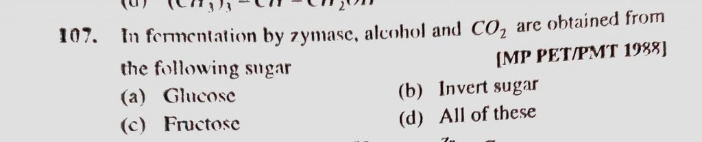 In fermentation by zymase, alcohol and CO2 are obtained from the following sugar (a) Glucose (b) Invert sugar (c) Fructose (d) All of these alcohol and CO2 are obtained from the following sugar (a) Glucose (b) Invert sugar (c) Fructose (d) All of these In fermentation by zymase February 13, 2021 Category: Uncategorised (JEE Advanced Physics by BM Sharma + GMP Solutions) , Facebook Messenger WhatsApp Share this:TwitterFacebook Related