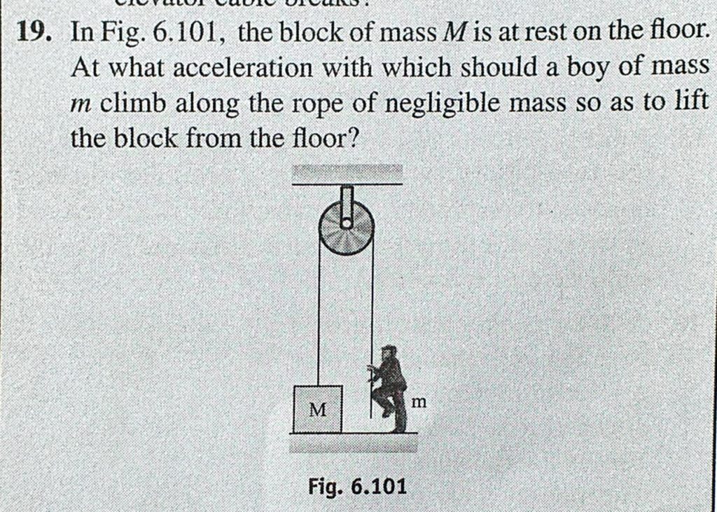 In Fig. 6.101, the block of mass M is at rest on the floor. At what acceleration with which should a boy of mass m climb along the rope of negligible mass so as to lift the block from the floor? In Fig. 6.101 the block of mass M is at rest on the floor. At what acceleration with which should a boy of mass m climb along the rope of negligible mass so as to lift the block from the floor? September 25, 2020 Category: Uncategorised (JEE Advanced Physics by BM Sharma + GMP Solutions) , Facebook Messenger WhatsApp Share this:TwitterFacebook Related