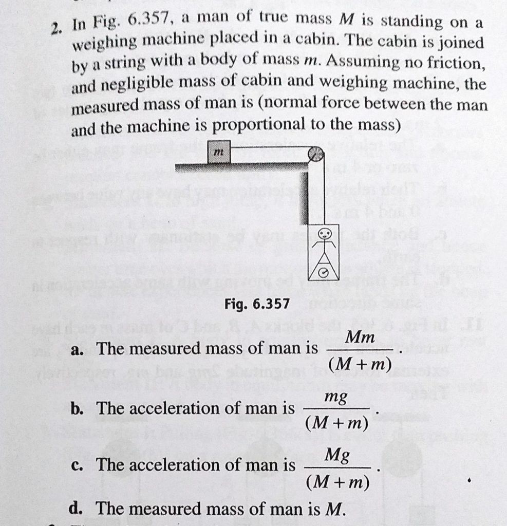 In Fig. 6.357, a man of true mass M is standing on a weighing machine placed in a cabin. The cabin is joined by a string with a body of mass m. Assuming no friction, and negligible mass a man of true mass M is standing on a weighing machine placed in a cabin. The cabin is joined by a string with a body of mass m. Assuming no friction and negligible mass In Fig. 6.357 September 29, 2020 Category: Uncategorised (JEE Advanced Physics by BM Sharma + GMP Solutions) , Facebook Messenger WhatsApp Share this:TwitterFacebook Related