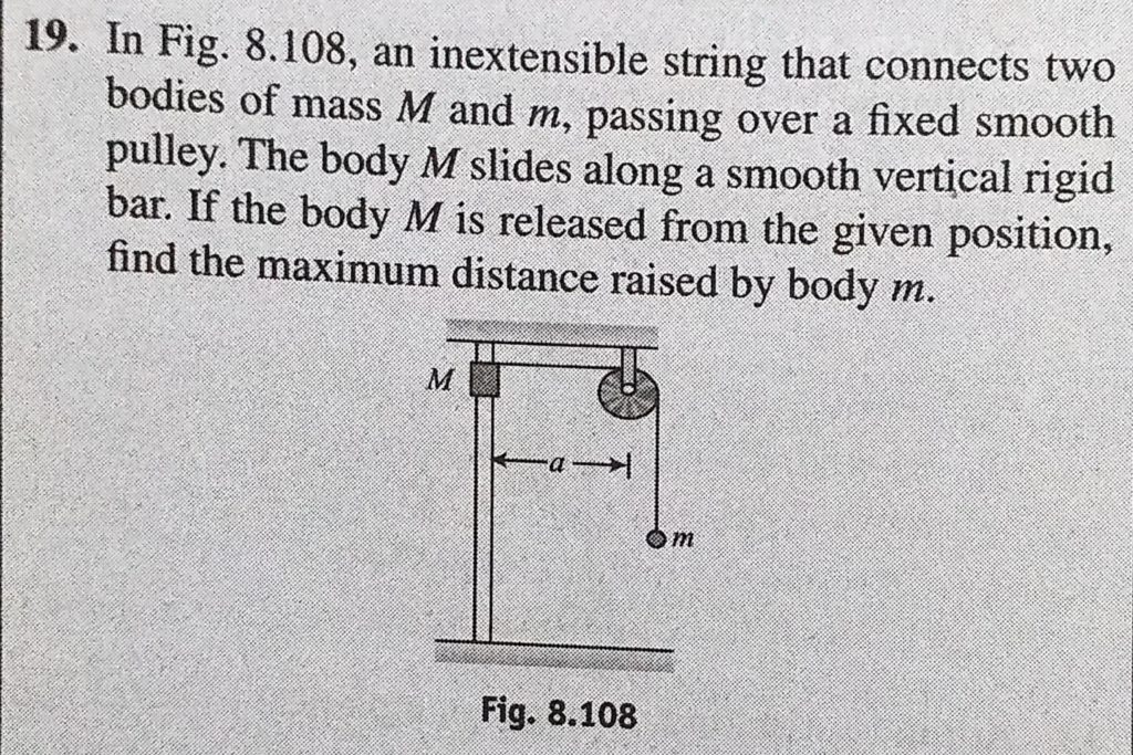 In Fig. 8.108, an inextensible string that connects two bodies of mass M and m, passing over a fixed smooth pulley. The body M slides along a smooth vertical rigid bar. If the body an inextensible string that connects two bodies of mass M and m In Fig. 8.108 passing over a fixed smooth pulley. The body M slides along a smooth vertical rigid bar. If the body October 3, 2020 Category: Uncategorised (JEE Advanced Physics by BM Sharma + GMP Solutions) , Facebook Messenger WhatsApp Share this:TwitterFacebook Related