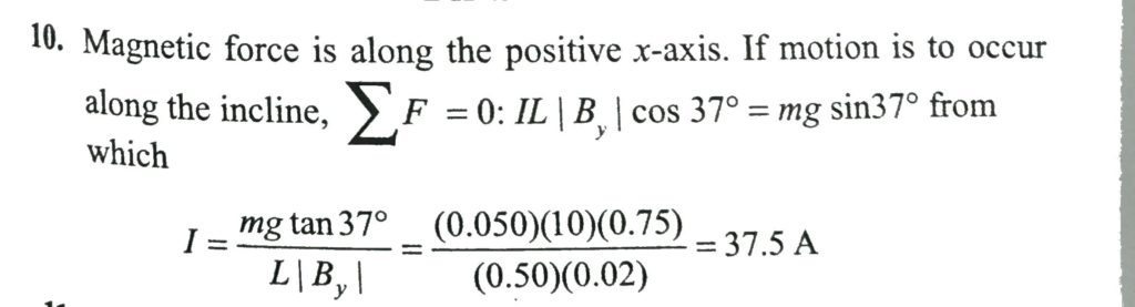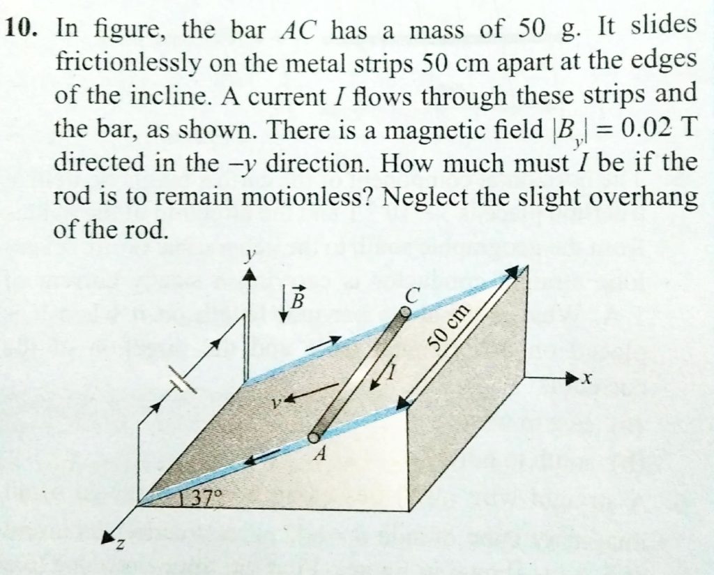 In Fig. the bar AC has a mass of 50 g. It slides frictionlessly on the metal strips 40 cm apart at the edges of the incline. A current I flows through these strips and the bar, as shown. There is a magnetic field |Bx|=0.02T directed in the -y direction. How much must I be if the rod is to remain motionless? Neglect the slight overhang of the rod.