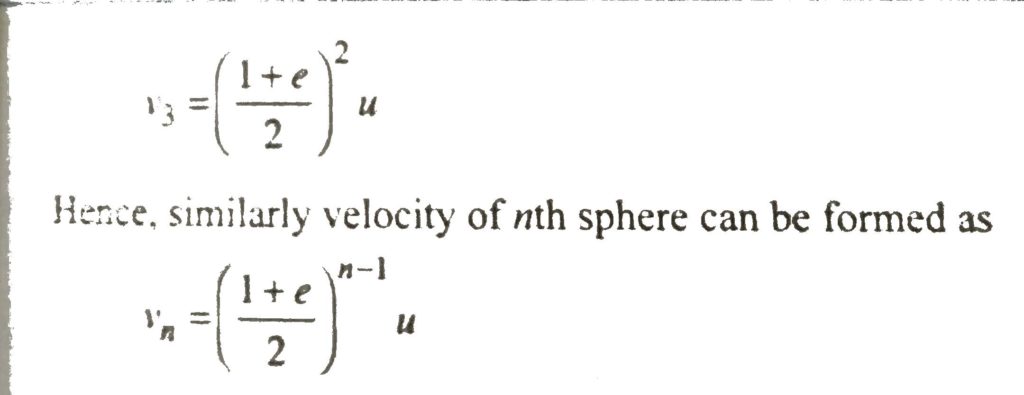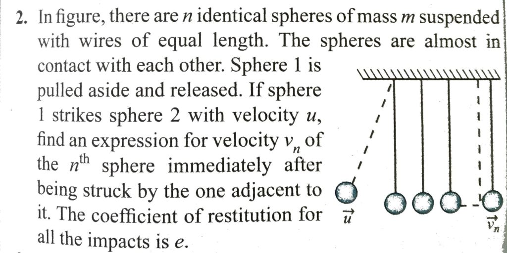 In Fig. there are n identical suspended with wires of equal length. The spheres are almost in contact with each other. Sphere 1 is pulled aside and released. If sphere 1 strikes sphere 2 with velocity u. find an expression for velocity vn of the nth sphere immediately after being struck by the one adjacent to it. The coefficient of restitution for all the impacts is e.