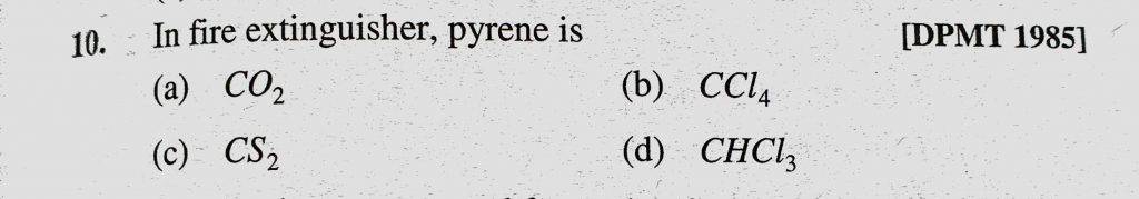 In fire extinguisher, pyrene is (a) CO2 (b) CCl4 (c) CS2 (d) CHCl3 In fire extinguisher pyrene is (a) CO2 (b) CCl4 (c) CS2 (d) CHCl3 February 9, 2021 Category: Uncategorised (JEE Advanced Physics by BM Sharma + GMP Solutions) , Facebook Messenger WhatsApp Share this:TwitterFacebook Related